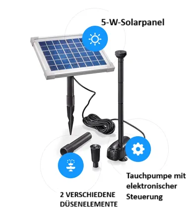 Solarbrunnen mit Solarpanel und Pumpe. Konzipiert für Teiche und Wassertanks bis zu 2000 Liter.