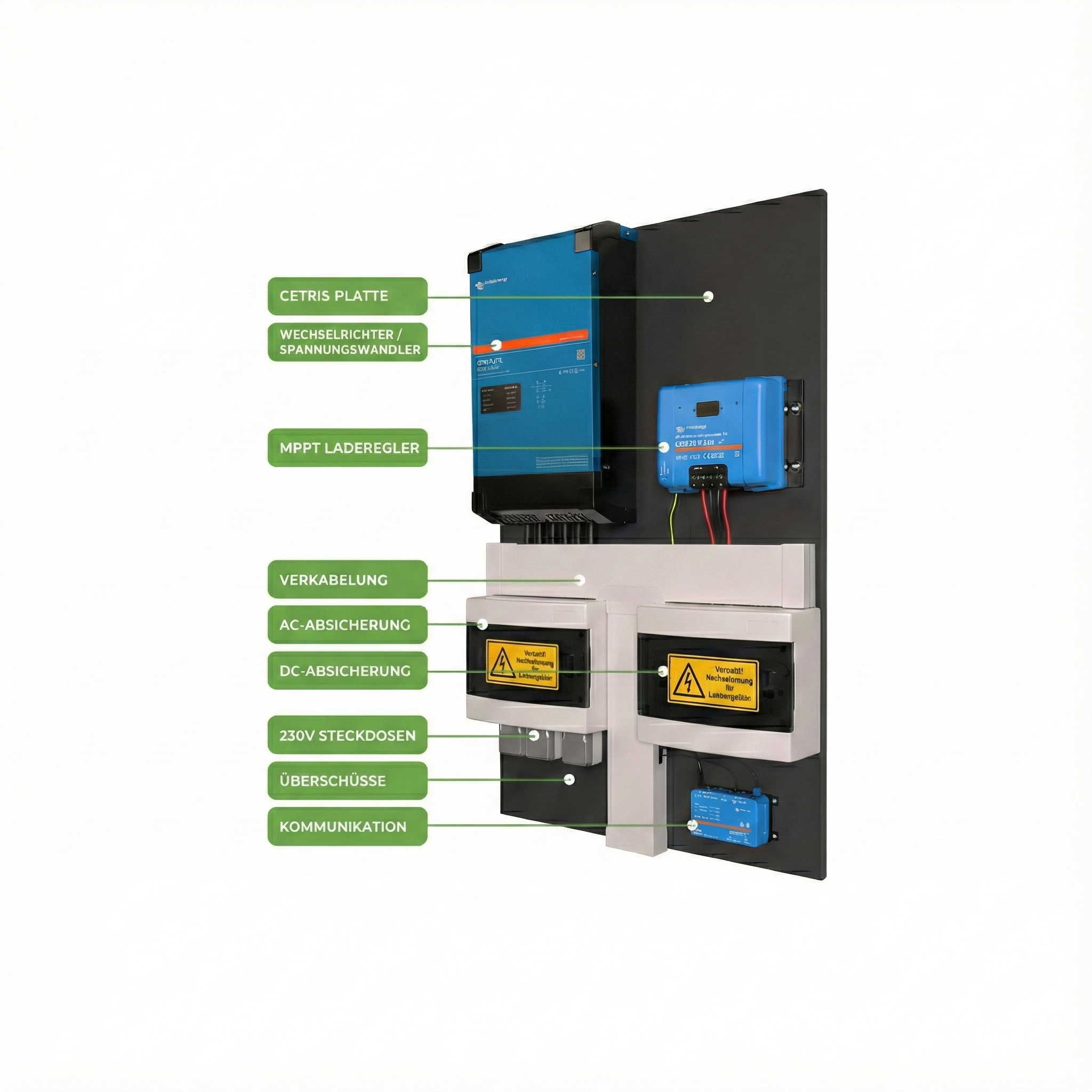 Vormontierte Photovoltaikanlage auf einer Montageplatte mit einer Jahresproduktion von bis zu 3 MWh. Es handelt sich um ein System mittlerer Größe mit 6 Solarmodulen und einem LiFePo4-Speicher, mit dem Sie schnell und einfach Energieunabhängigkeit für Ihr Haus oder Ihr Ferienhaus erreichen.