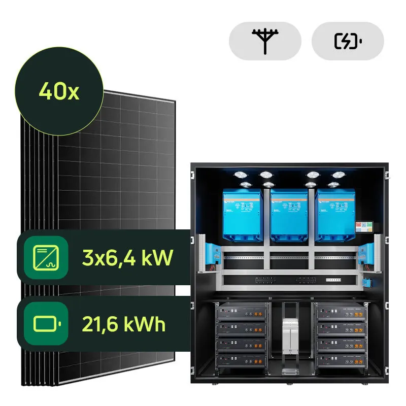 Vormontierte 3-phasige Victron Hybrid-Solaranlage 21,6kWp 21,6kWh im Rack