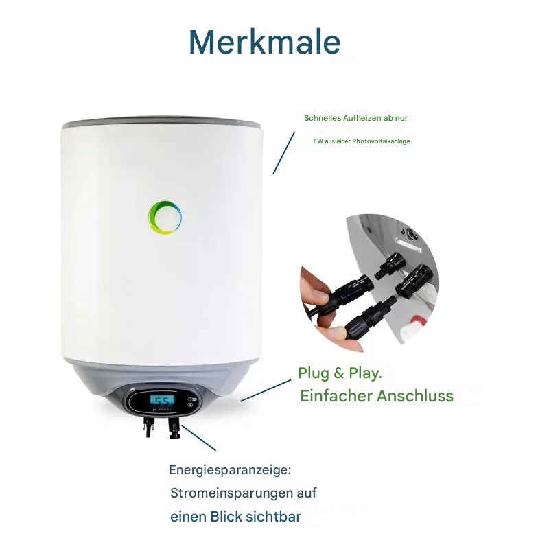 Photovoltaikanlage bestehend aus einem 30-Liter-Speicher, einem 535-Wp-Solarmodul, 10 m Kabel, Verteilerkasten, Sicherungstrennschalter und Sicherungen. Alles, was Sie für den Anschluss und die Erwärmung von Wasser mit Hilfe der Sonne benötigen, steht Ihnen zur Verfügung.