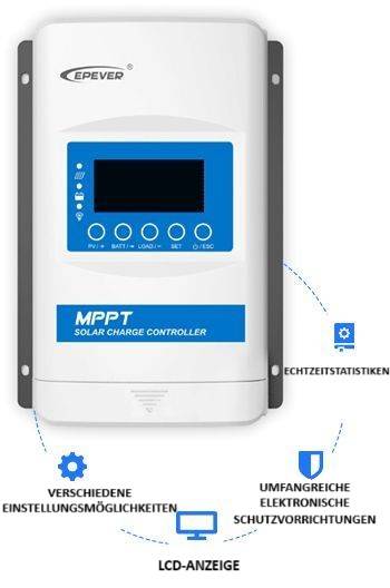 Der Solarregler ist mit der neuesten MPPT-Technologie (Maximum PowerPoint Tracking) ausgestattet – Nachführung des Maximum Power Point mit einem ausgefeilten Algorithmus, bei dem das Solarmodul mit optimaler Spannung arbeitet. Im Vergleich zu herkömmlichen PWM-Reglern erhöht die MPPT-Technologie den Ladewirkungsgrad um ca. 30%.
