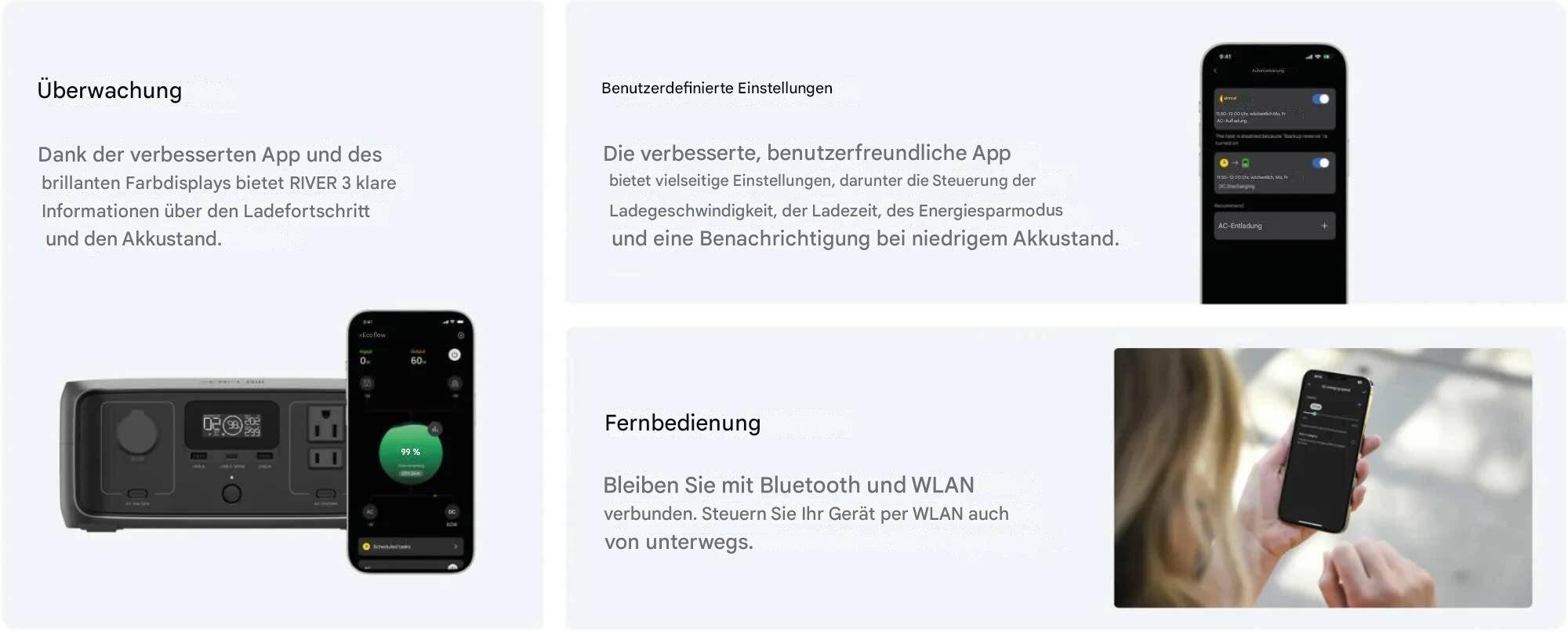 Die RIVER 3 Plus bringt noch mehr Leistung, eine professionelle USV mit einer Schaltgeschwindigkeit von bis zu 10 ms und der Möglichkeit der Kapazitätserweiterung mit einer zusätzlichen Batterie bis zu 858 W. Sie kann einfach entweder über die Netzsteckdose, die Steckdose während der Fahrt oder über Solarzellen aufgeladen werden.
