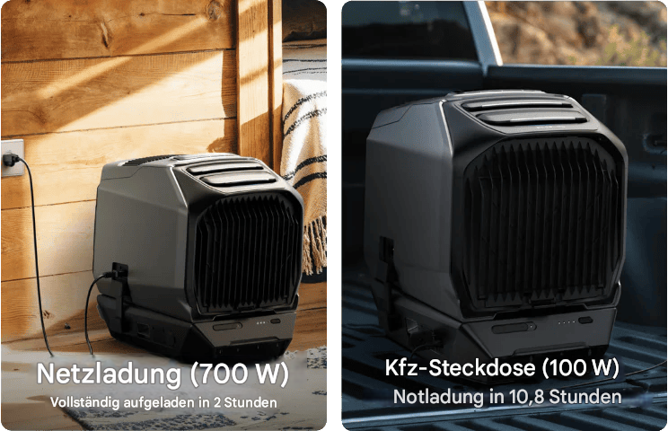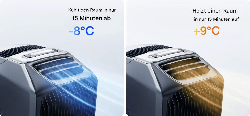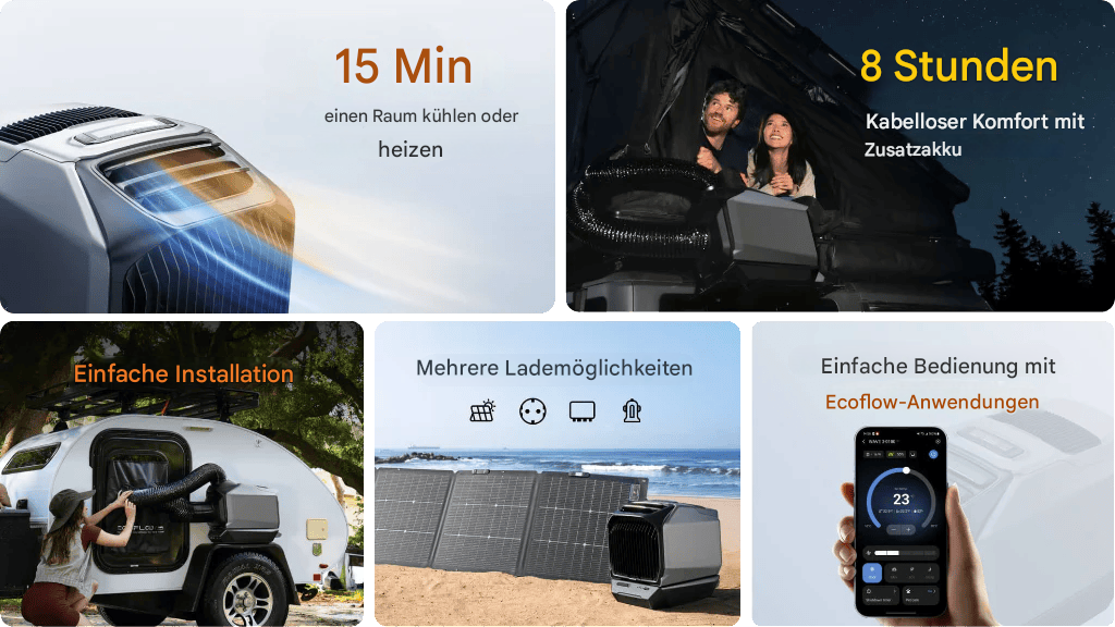 Die EcoFlow WAVE 3 ist eine leistungsstarke, kabellose, tragbare Klimaanlage für Outdoor-Enthusiasten, die Wert auf Leistung, Flexibilität und Komfort legen. Mit 6100 BTU Kühlleistung und 6800 BTU Heizleistung eignet sie sich ideal für vielfältige Anwendungen, z. B. in Autos, Zelten, Wohnmobilen und mehr. Sie schafft überall, während Ihrer Reise oder Ihres Aufenthalts, eine angenehme Umgebung.