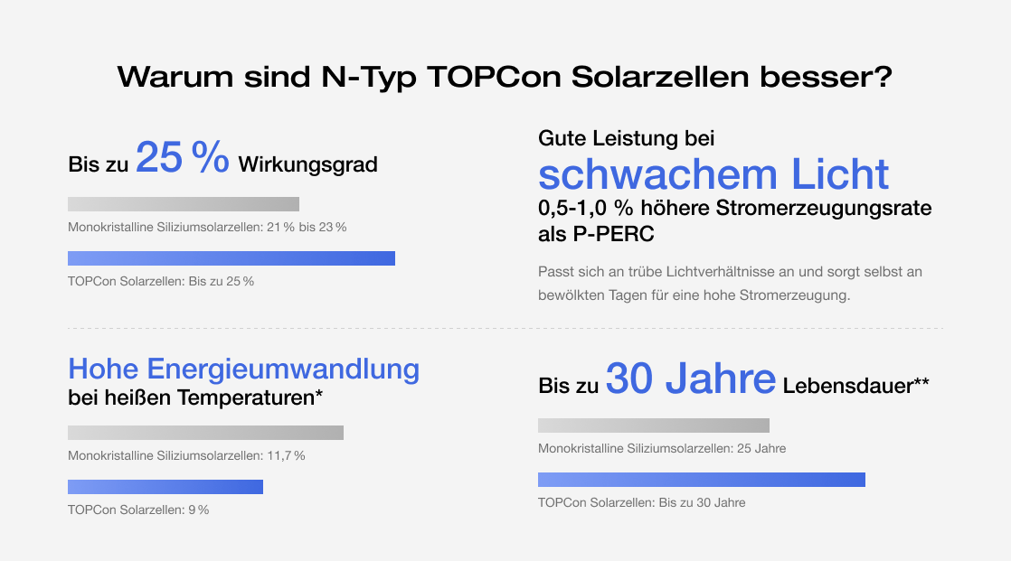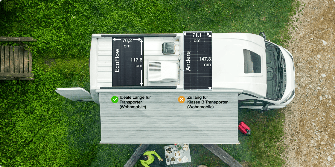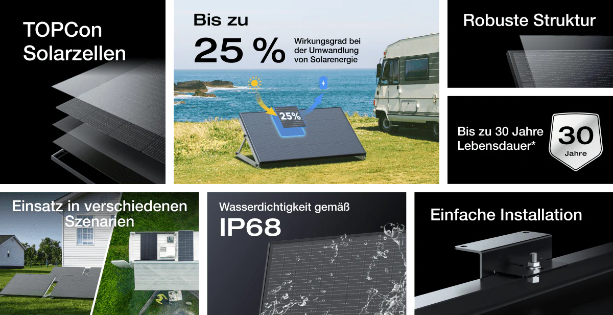 Solarmodul mit bis zu 25 % Wirkungsgrad und TOPcon-Zellen für zuverlässige Leistung auch unter schwierigen Bedingungen. Dank IP68-Schutz, einfacher Installation und einer Lebensdauer von bis zu 30 Jahren ist es die ideale Lösung für Campervans und den Heimgebrauch.