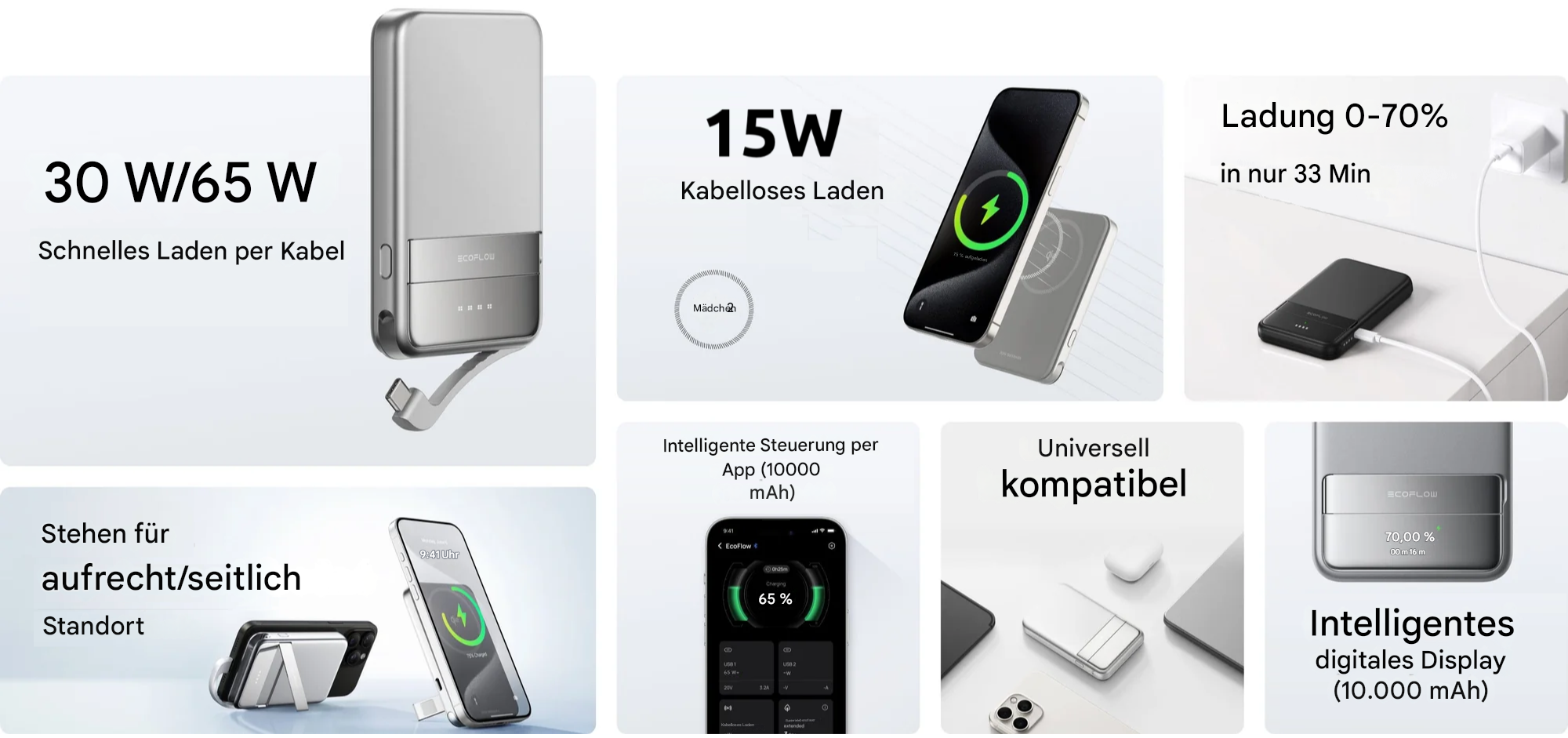 Bietet schnelles kabelloses Qi2-Laden mit 15 W – doppelt so schnell wie die vorherige Generation. Das integrierte 65W-Kabel ermöglicht ultraschnelles Laden ohne zusätzliches Zubehör. Von 0 % auf 70 % in weniger als 33 Minuten geladen. Klappständer sorgt für bequemes Betrachten. Intelligentes Display zeigt Leistung und Akkustand an, App bietet individuelle Einstellungen und Standortsuche.