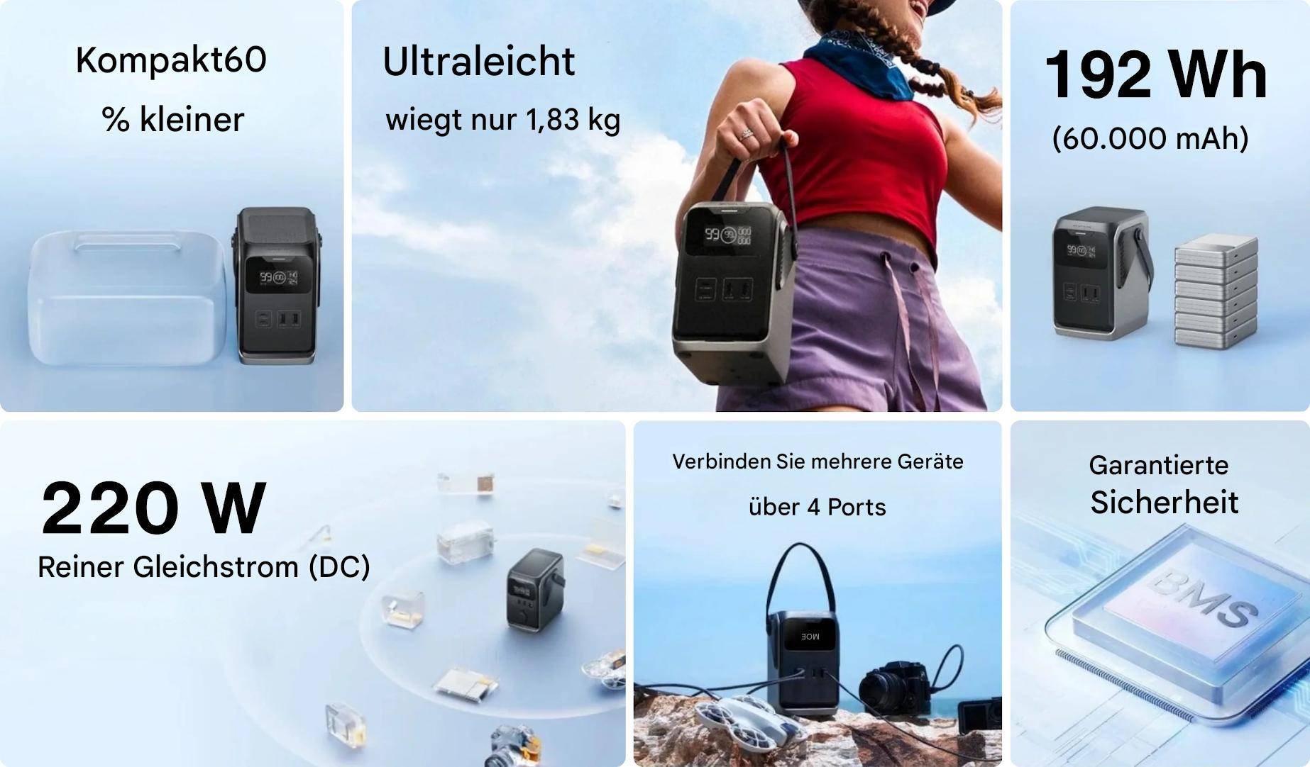 Diese kompakte und leichte Batteriestation mit einer Kapazität von 192 Wh und einer Gesamtleistung von 220 W ist eine ideale Energiequelle zum Campen, Reisen, Angeln oder für Outdoor-Veranstaltungen. Sie kann Lampen, Kameras, Tablets, Lautsprecher und andere Geräte mit Strom versorgen. Dank der robusten Konstruktion und des sehr kompakten Designs lässt sie sich leicht transportieren und passt problemlos in einen Rucksack. Mehrere Ausgangsports ermöglichen die gleichzeitige Stromversorgung mehrerer Geräte.