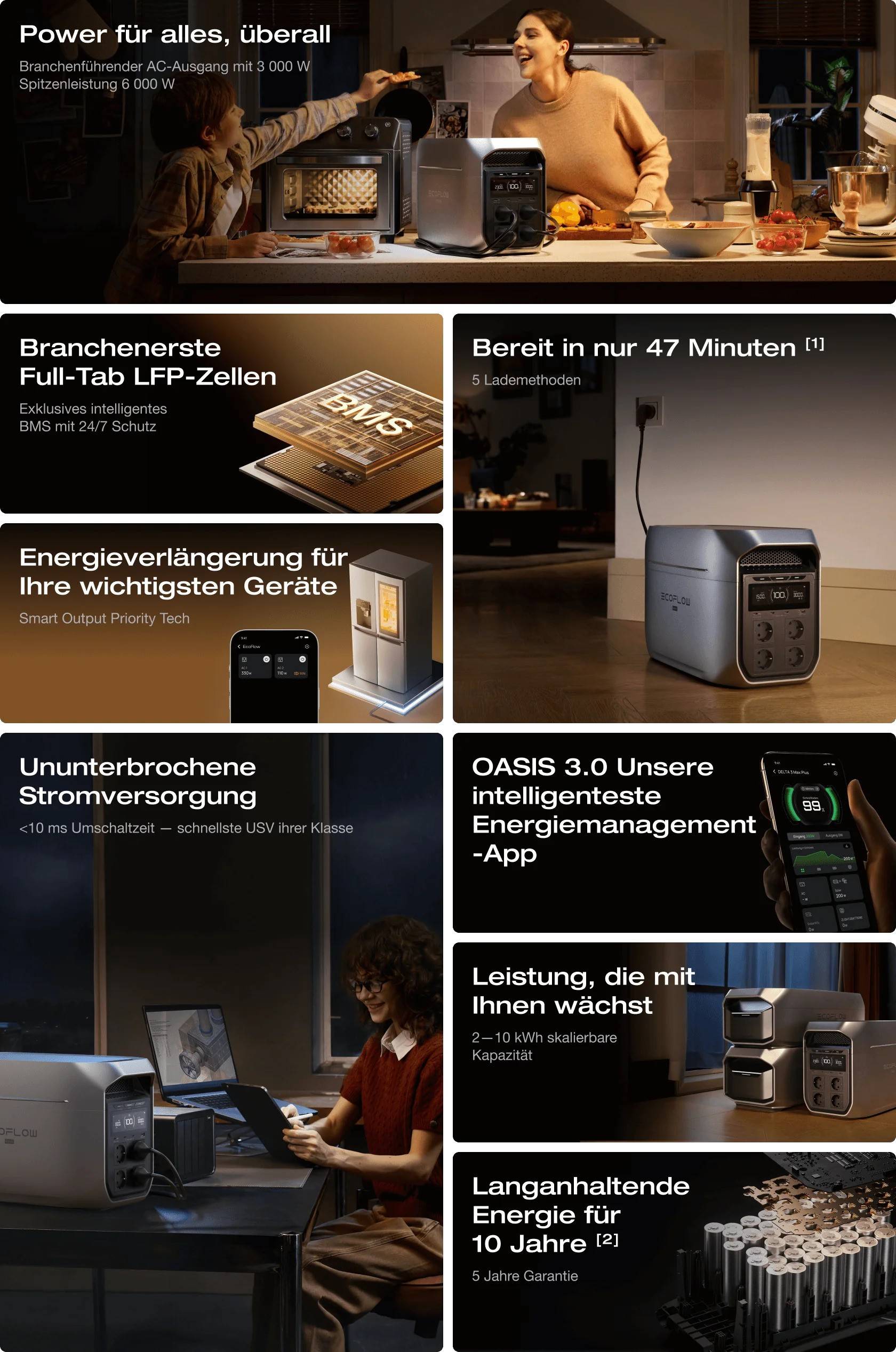 Die tragbare Powerstation bietet eine Nennleistung von 2.400 W und kann dank X-Boost auch Geräte mit einem Verbrauch von bis zu 3.200 W versorgen. Die Kapazität von 2.048 Wh liefert genügend Energie für die meisten Haushaltsgeräte, und der UPS-Modus mit einer Umschaltzeit von unter 10 ms sorgt für eine zuverlässige Notstromversorgung bei Stromausfällen.
