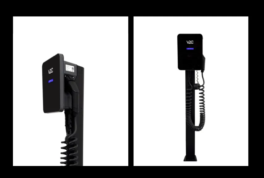 Eleganter schwarzer Sockel aus hochwertigem Edelstahl für V2C Trydan/Pro-Ladestationen. Ideal für den Innen- und Außenbereich in Garagen, Parkplätzen oder Arbeitsbereichen. Bietet maximale Flexibilität bei der Installation, Widerstandsfähigkeit gegen widrige Witterungsbedingungen und eine lange Lebensdauer.